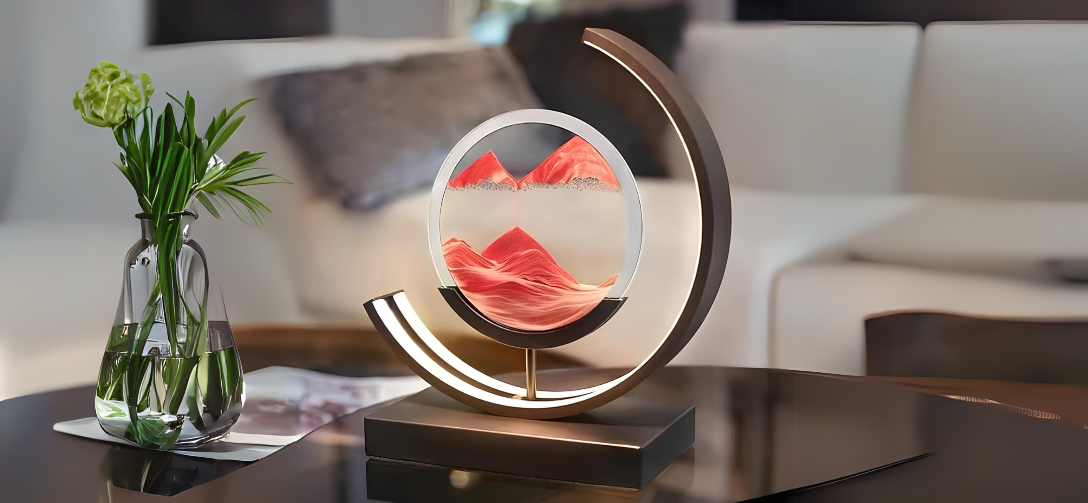 Un flux de sable éclairé qui tourne lentement à 360°, créant des motifs naturels hypnotisant à chaque renversement.